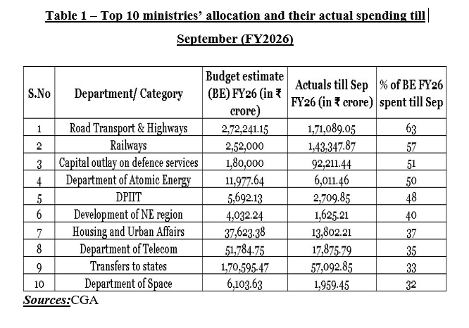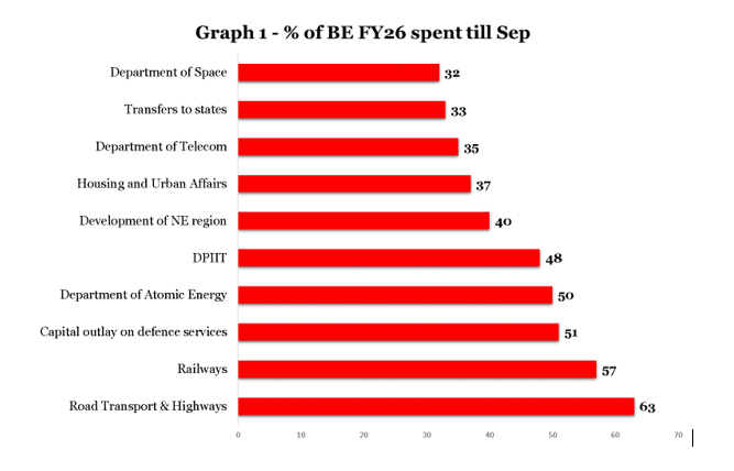 The ministries of Road Transport and Highways and Railways have exceeded the national average capital expenditure (capex) by spending 63 percent and 57 percent of the Budget estimates (BE) in the first half of FY26. The total capital expenditure for April-September of FY26 was at 52 percent of the BE.