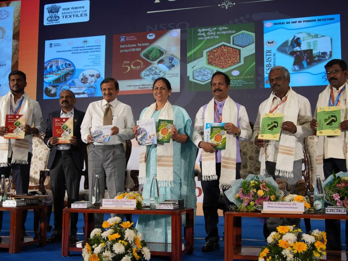 Bengaluru: Union Minister of State for Micro, Small and Medium Enterprises Shobha Karandlaje recently inaugurated the Golden Jubilee celebrations of the National Silkworm Seed Organization (NSSO) under the Central Silk Board in Bengaluru, where she also released a special postal stamp commemorating the NSSO.