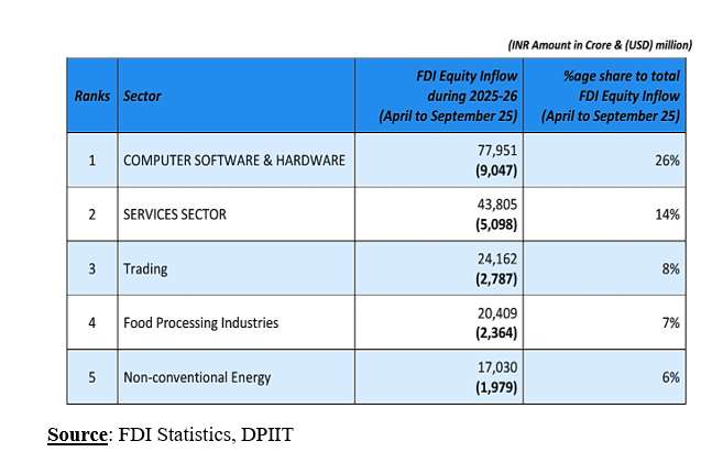 The computer software and hardware sector took the top five percentage share of total FDI equity inflow with 26 percent, followed by the service sector with 14 percent in FY 2025-26.