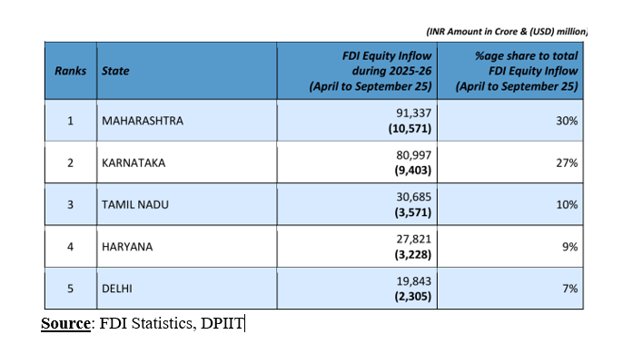 Maharashtra tops among states in attracting 30 percent of total FDI, followed by Karnataka with 27 percent in FY 2025-26. Here is the share of top five states attracting the highest FDI equity inflow: