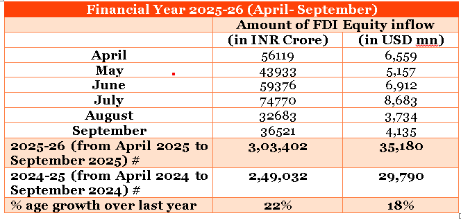 The following table shows FDI inflow (month-wise) during FY 2025-26.