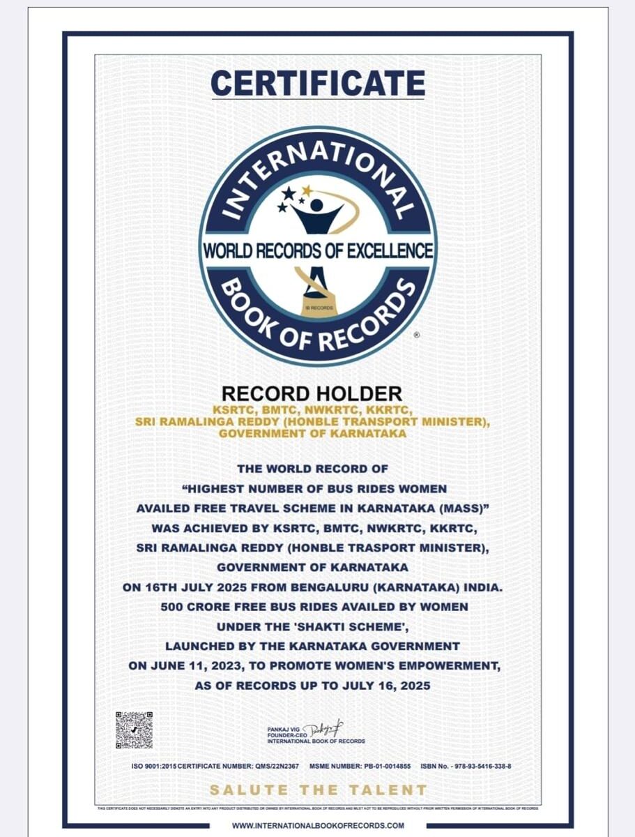 With over 500 crore free tickets issued to women, the scheme has now been recognized in the International Book of Records – World Record of Excellence.