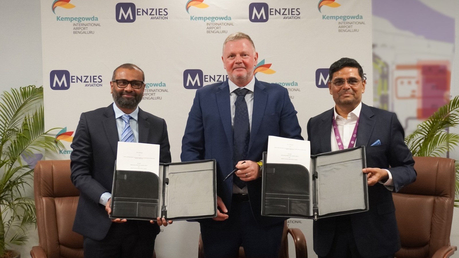 Girish Nair, COO, BIAL, Charles Wyley, EVP Middle East, Africa & Asia, Menzies Aviation, and Bhaskar Anand Rao, CFO, BIAL, with the signed declaration.